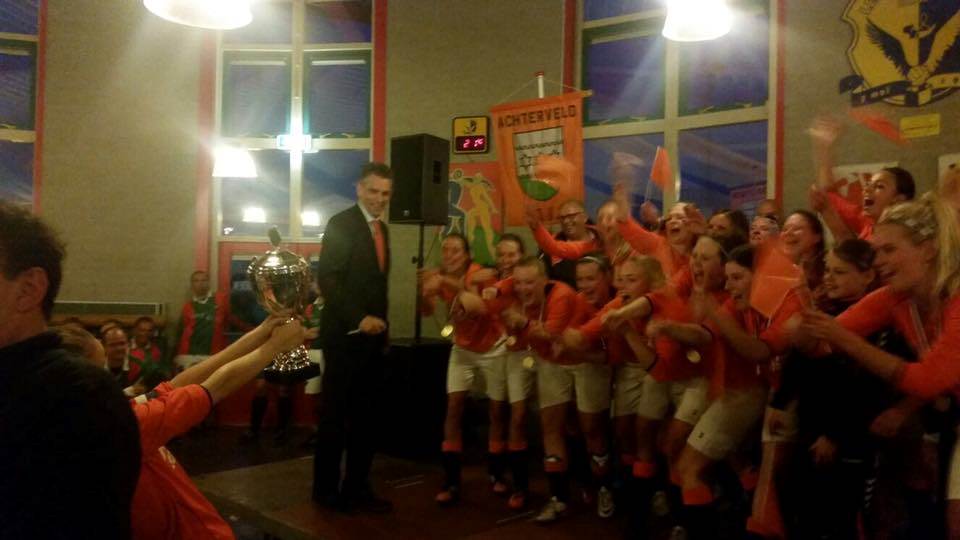 Na een ererondje langs het publiek, met vuurwerk en al, kregen we bloemen en konden we in polonaise de kantine betreden voor de prijsuitreiking. Het koude biertje had het hele seizoen nog niet zo lekker gesmaakt als vanavond. En wat een heerlijk moment: onze naam werd genoemd en al springend mochten we het podium betreden. We overtroffen al het feestgedruis en Achterveld is weer op de kaart gezet. Met gouden plakken om onze nek en onze Bekerbaby in de hand was het tijd voor een heerlijk verfrissende douche. Want de avond zou nog lang gaan worden!