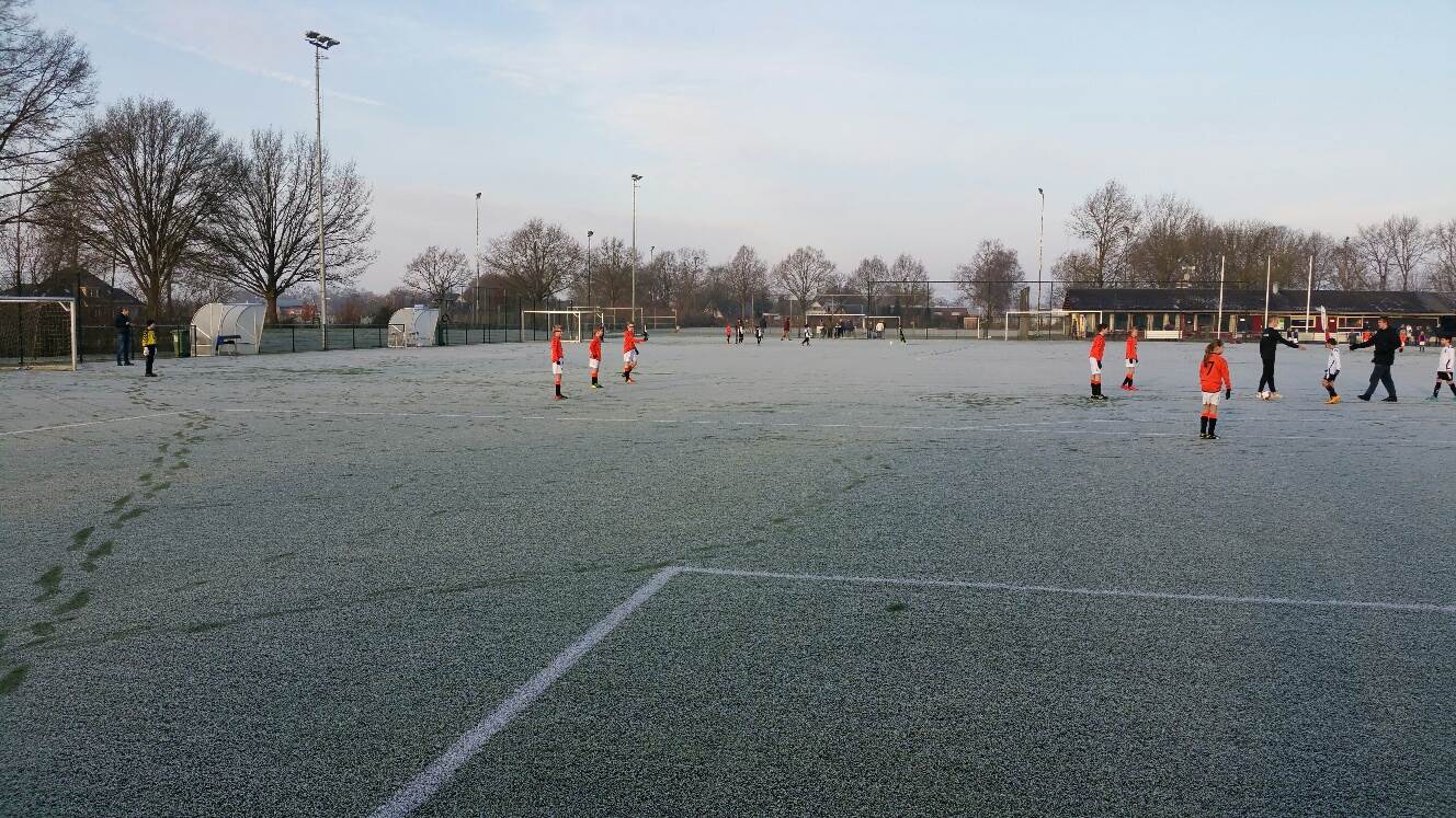 De enige verrassing vanochtend is dat het gevroren heeft. Het veld is dus helemaal wit, maar niet glad. En het zonnetje schijnt heerlijk, dus een mooie ochtend om lekker te voetballen!