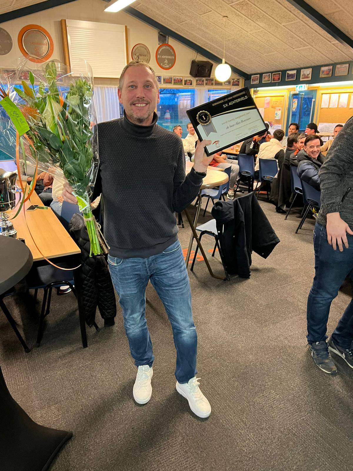 Alex is al van jongs af aan lid van onze vereniging, waar hij begon met zelf voetballen maar op jonge leeftijd (15 jaar) ook vrijwilligerstaken op zich nam. Alex is begonnen als scheidsrechter en is daarna vrij snel als jeugdtrainer aan de slag gegaan. Daarna heeft Alex deel uitgemaakt van het jeugdbestuur, hoofdbestuur, technische commissie, draait Alex kantinediensten, is grensrechter geweest bij Heren 1, trainer van zowel senioren heren als dames en dit seizoen heeft ie onze beginnende vrouwen van het 7x7-team onder zijn hoede genomen en de basisprincipes van het voetballen bijgebracht!