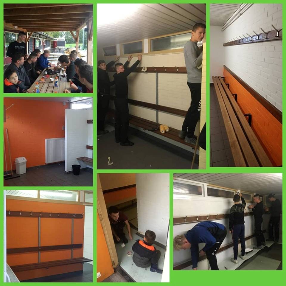 Op de klussendag was het team grotendeels aanwezig om de kleedkamers even een opfrisbeurt te geven. Onder de bezielende leiding van hun grote leider Arjan, ondersteund door Mihai, gingen ze vol goede moed aan de slag.