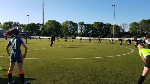 Na wat rek-en-strekoefeningen onder leiding van Renske en Melanie werd er vervolgt met een circuittraining. Waarbij ook de trainers van de MO15 en MO17, Maaike, Hase en Xander hielpen.