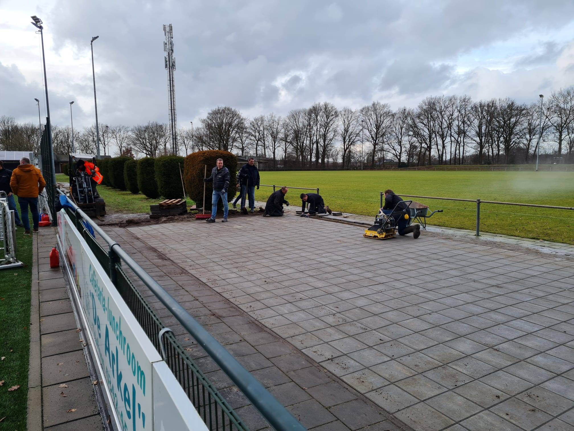 Er is weer hard gewerkt tijdens de klussendag door de 25 aanwezige vrijwilligers. Zo hebben we de buitenkant van de kantine schoongemaakt, zijn de zonnepanelen gereinigd, de reclameborden langs het veld weer mooi schoon gemaakt, de doelnetten van de pupillendoelen vervangen, de netten in de ballenvangers weer vastgemaakt, een paar deuren van de kleedkamers opgeknapt en is er een mooi pleintje betegeld tussen veld 1 en veld 2, waar de trainingsdoeltjes mooi kunnen worden opgeslagen.