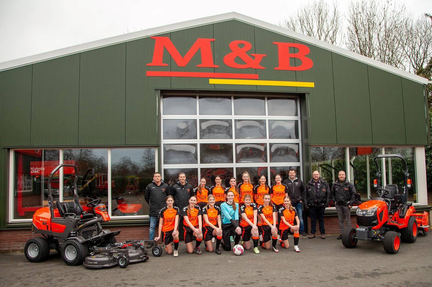 in deze prachtige tenues! Dit jaar zijn zij in het nieuw gestoken door M&B! Voor de foto’s moest er natuurlijk ook even in de werkplaats gekeken worden. M&B van Burgsteden zijn zoals ze het zelf omschrijven: “Van alles wat, maar vooral een eerlijk advies en snelle service bij technische uitdagingen voor landbouwvoertuigen, maairobots, onderdelen voor je bus en noem het maar op. Zowel verkoop als onderhoud! Mario en Bert bedankt voor de mooie tenues en hopelijk gaan de meiden hier vele punten mee pakken! ![]()