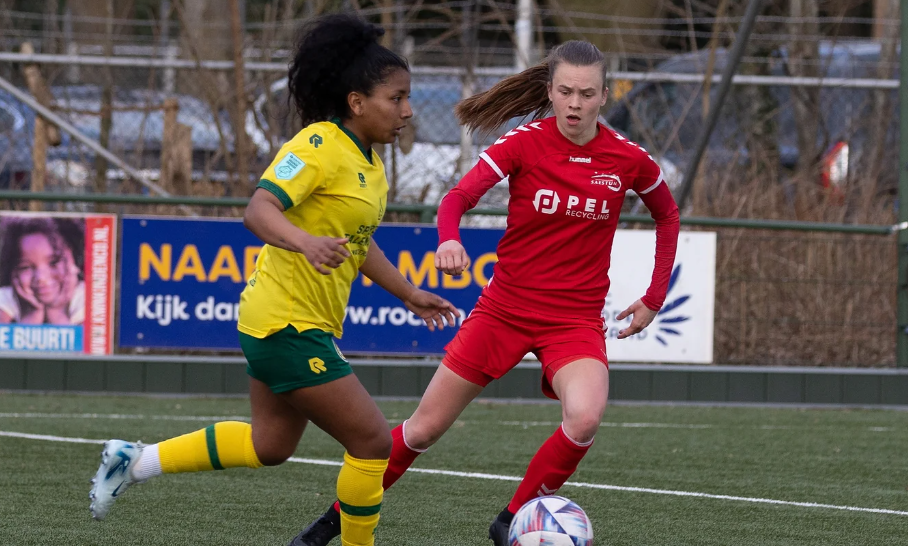 ,,Bij SV Achterveld speelde ik altijd bij de jongens, maar die worden rond hun zestiende rossen groter en fysieker. Dus keek ik of ik kon aansluiten bij een vrouwenploeg op een hoger niveau. Ik kwam uit bij Saestum, omdat ze een goede naam hebben en mijn trainer van voltooid bij Achterveld de vader van Danique van Ginkel is.”