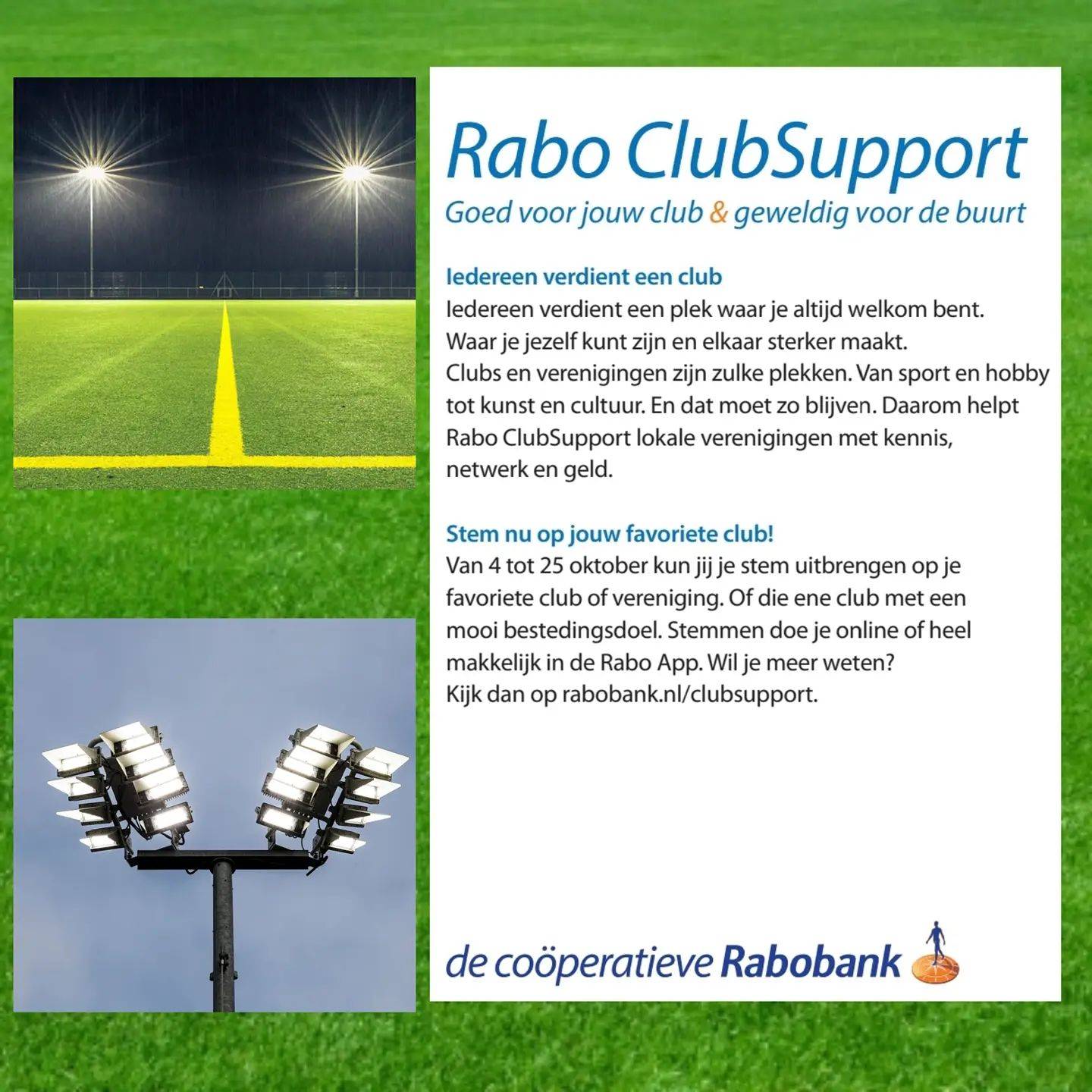 Wij doen mee met Rabo ClubSupport! Met de opbrengst willen we onze vereniging verder verduurzamen door o.a. de aanschaf van LED verlichting. Kunnen wij op jouw stem rekenen?