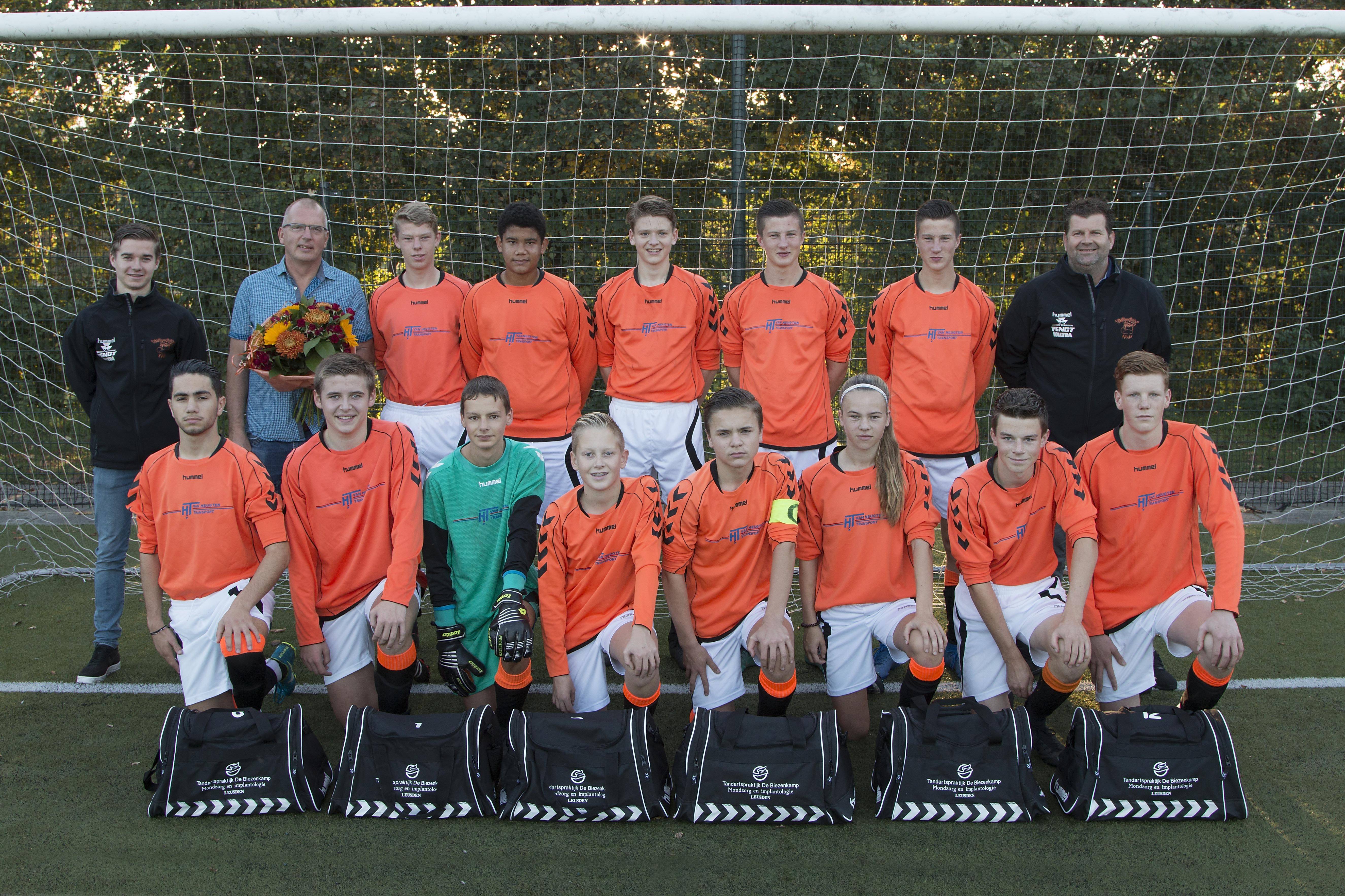 Achterveld JO17-1 is voorzien van mooie nieuwe tassen door Tandartsenpraktijk De Biezenkamp.