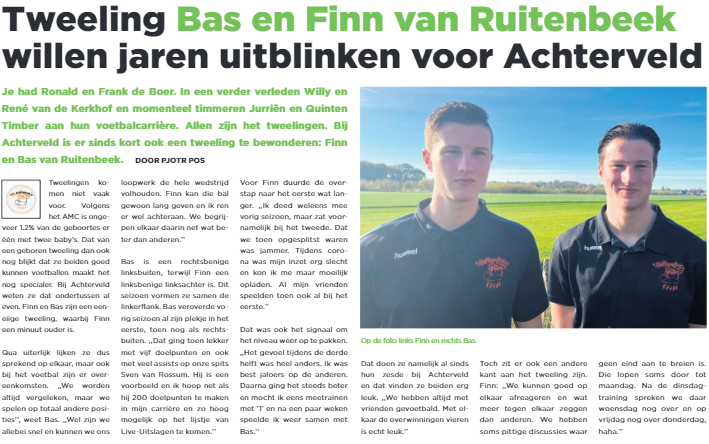 Dat doen ze namelijk al sinds hun zesde bij Achterveld en dat vinden ze beiden erg leuk. ,,We hebben altijd met vrienden gevoetbald. Met elkaar de overwinningen vieren is echt leuk.’’ Toch zit er ook een andere kant aan het tweeling zijn. Finn: ,,We kunnen goed op elkaar afreageren en wat meer tegen elkaar zeggen dan anderen. We hebben soms pittige discussies waar geen eind aan te breien is. Die lopen soms door tot maandag. Na de dinsdagtraining spreken we daar woensdag nog over en op vrijdag nog over donderdag, haha.’’