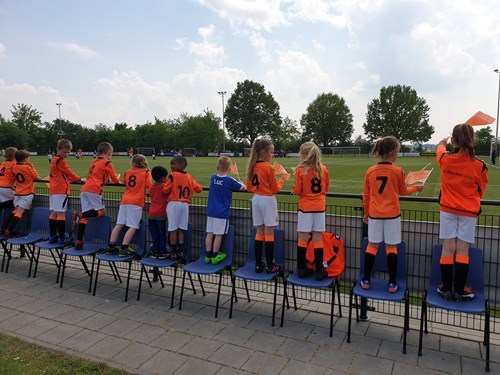 En tijdens de wedstrijd met z'n allen op de speciaal gecreëerde tribune de grote voorbeelden toejuichen met oranje vlaggetjes!